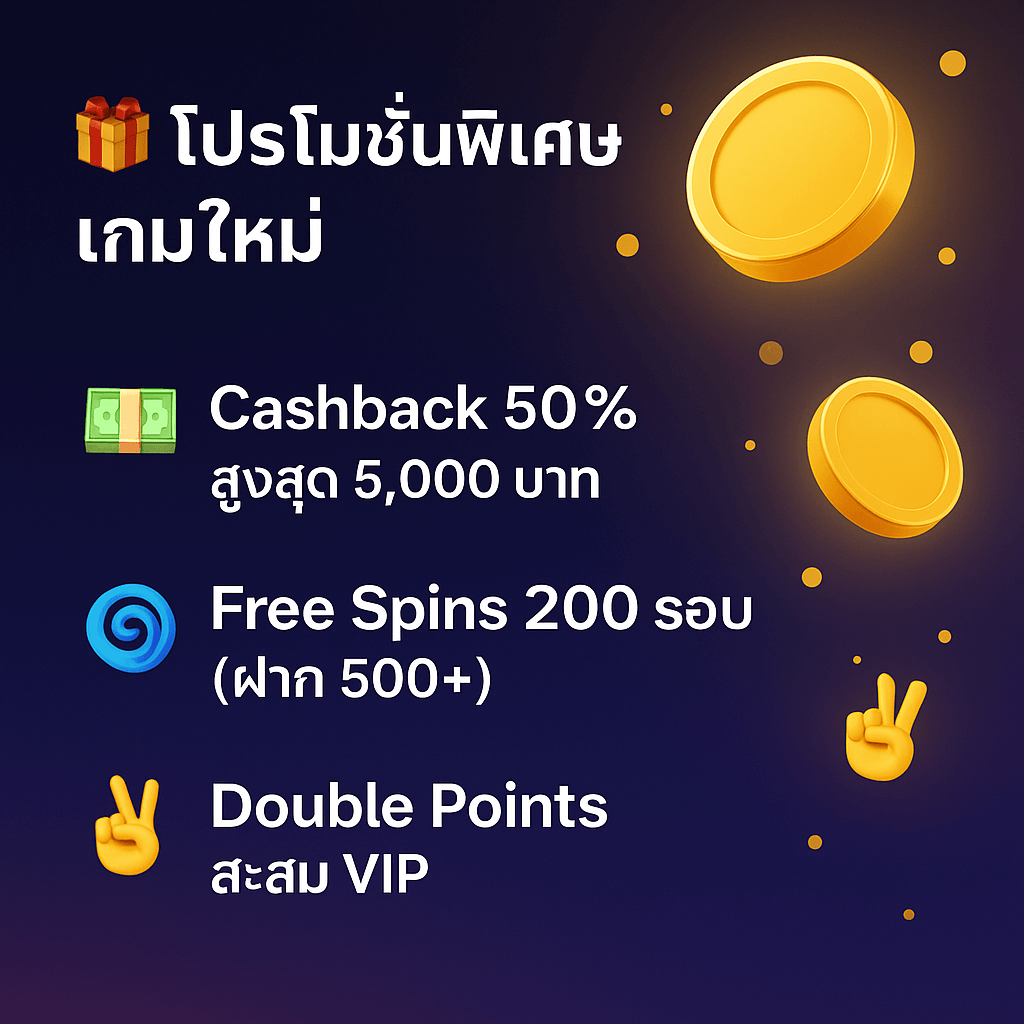Cashback 50% สูงสุด 5,000 บาท Free Spins 200 รอบ (ฝาก 500+) Double Points สะสม VIP ลุ้น iPhone 15 Pro ทุก 1,000 สปิน